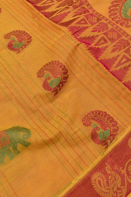 Orange Pure South Cotton Elephant Peacock Butta Rich Pallu Saree