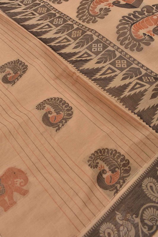 Light Brown Pure South Cotton Elephant Peacock Butta Rich Pallu Saree