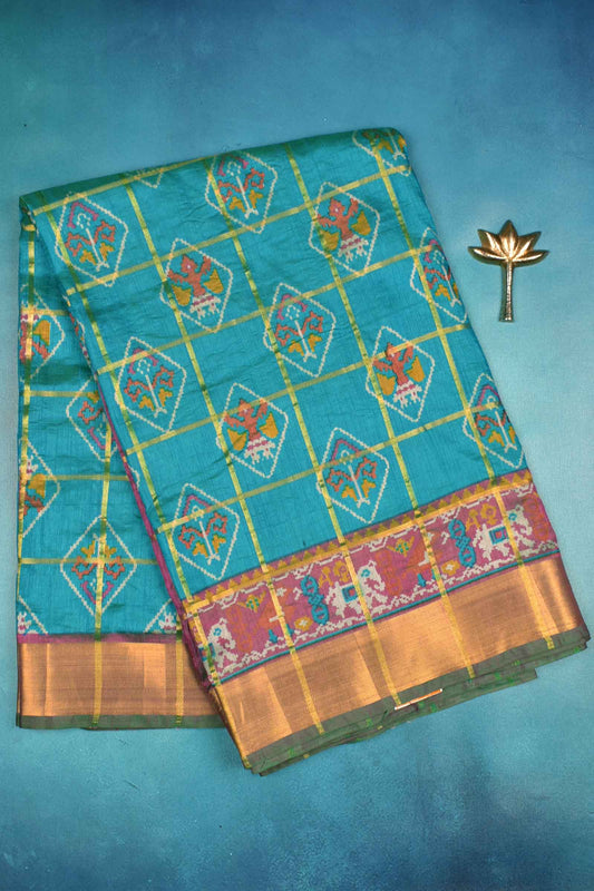 Blue Sana Silk Golden Diamond Checks Zari Border Saree