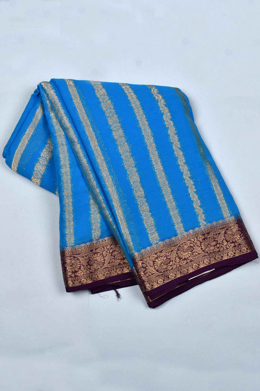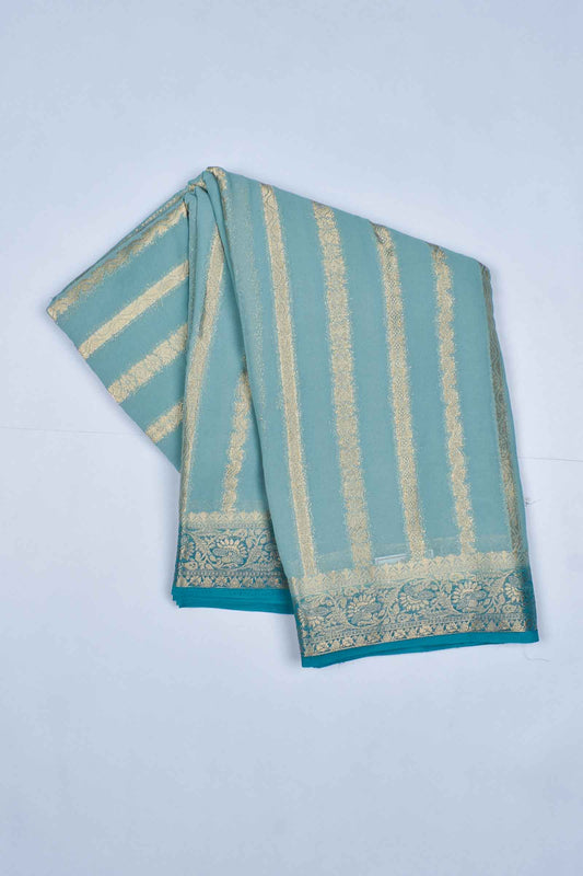 Azure Blue Georgette Gold Stripes Contrast Pallu Saree