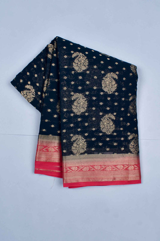 Navy Blue Georgette Mango Butta Contrast Pink Pallu Saree