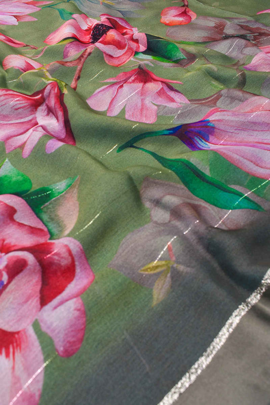 Multi Green Georgette Jari Lines Printed Satin Border Saree