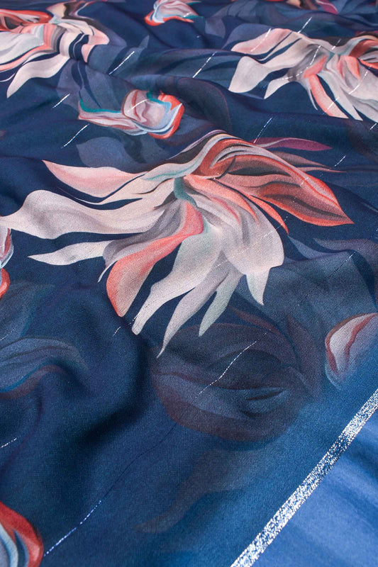 Blue Georgette Jari Lines Floral Printed Satin Border Saree