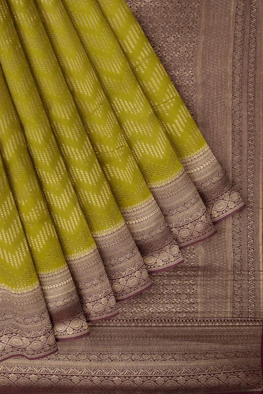Lime Yellow Georgette All Over Golden Sreaks Design Maroon Border Saree