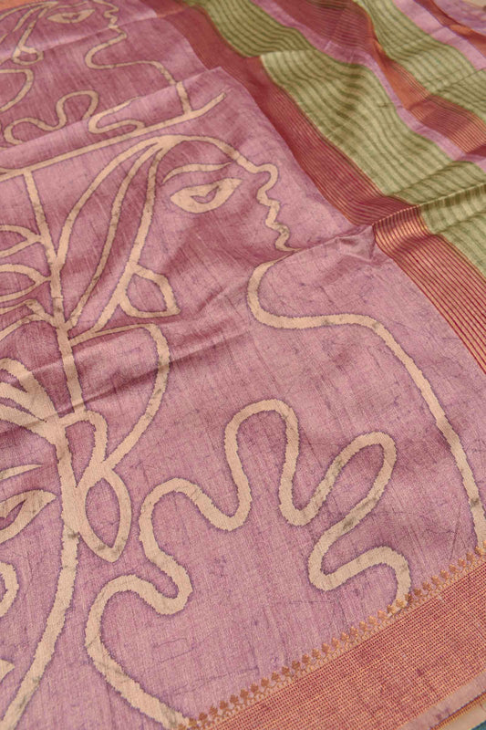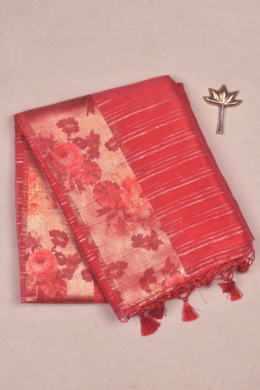 Wine Purple Organza Silk Rain Lines Floral Print Border Saree