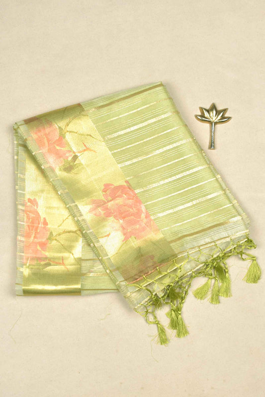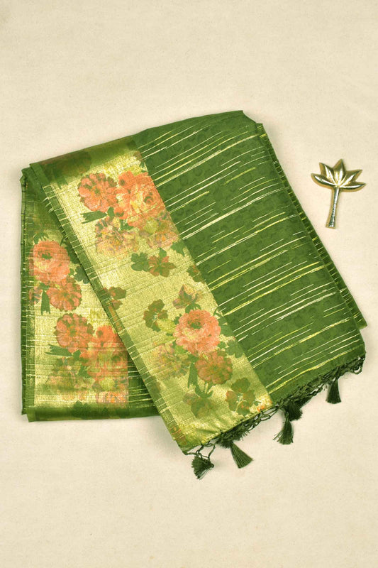 Olive Green Organza Silk Zari Lines Floral Border Saree