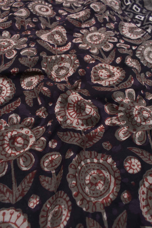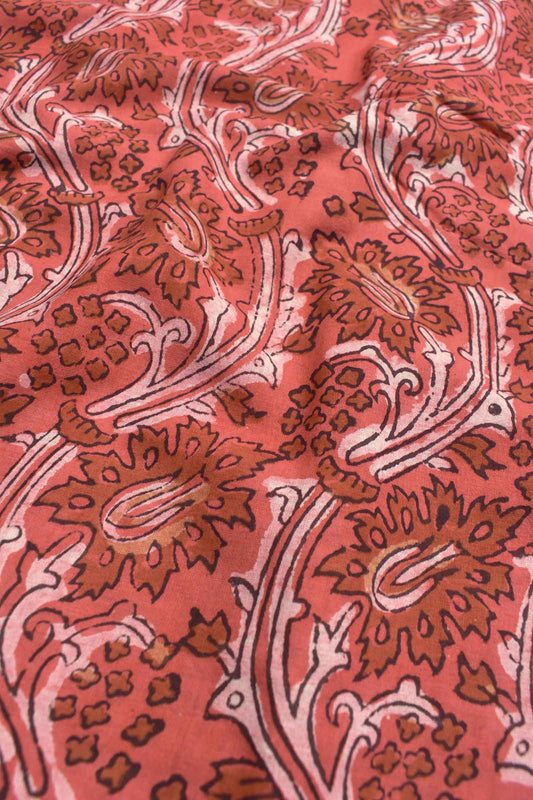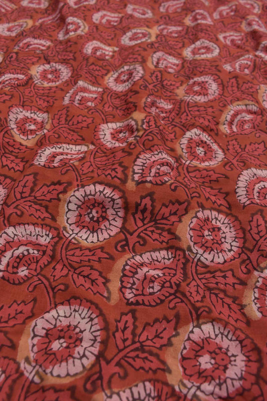 Dark Peach Pure Jaipur Cotton Floral Hand Block Print Ajrakh Pallu Saree
