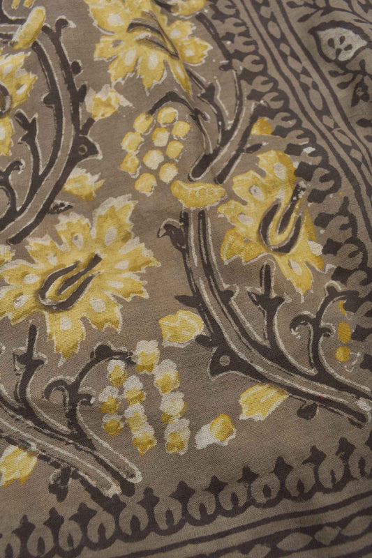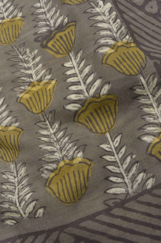 Dark Grey Pure Soft Cotton Vanaspati Handblock Floral Print Saree