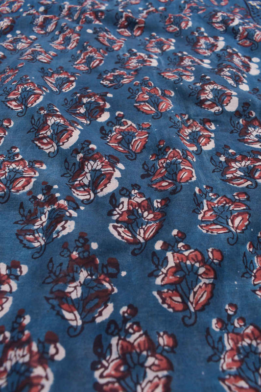 Blue Pure Soft Cotton Vanaspatti Handblock Contrast Red Flowers Printed Saree