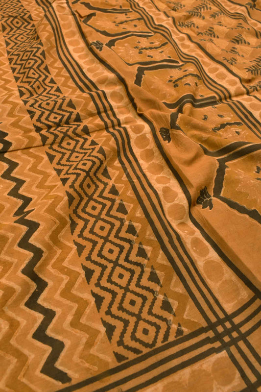 Brown Pure Soft Cotton Vanaspatti Handblock Fir Cone Printed Saree