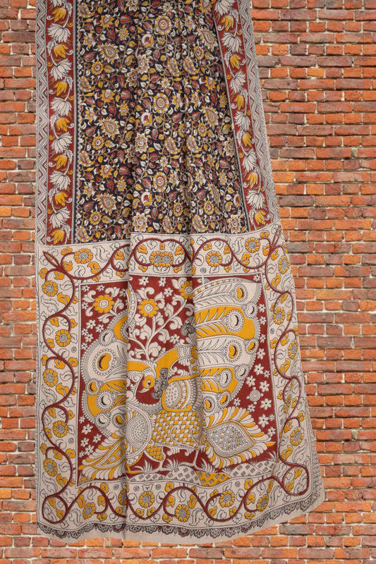 Black Kalamkari Pure Cotton Crimson Garden Printed Peacock Border Saree