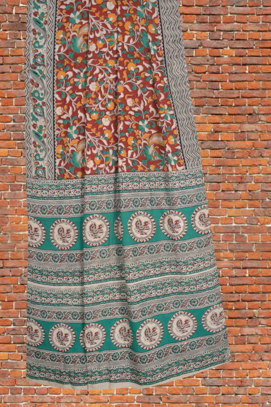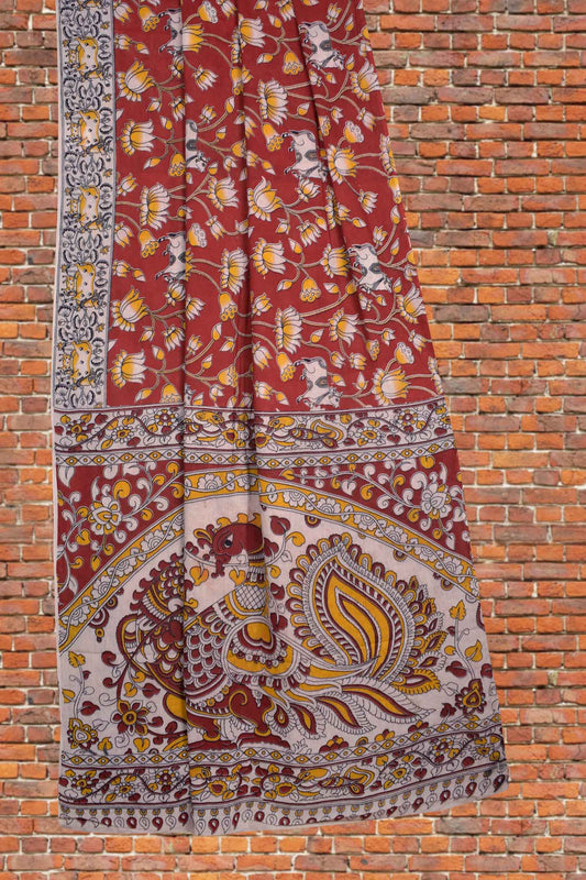 Red Kalamkari Pure Cotton Floral Peacock Printed Peacock Pallu Saree
