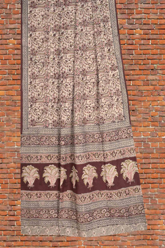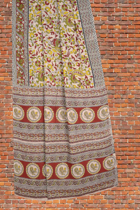 Off White Kalamkari Pure Cotton Floral Peacock Printed Peacock Pallu Saree