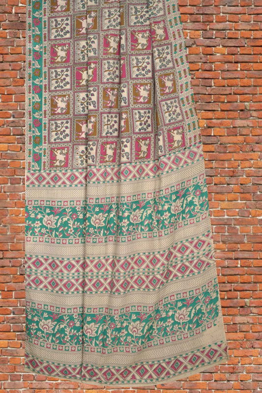 Multi Colour Kalamkari Pure Royal Cow Frames Floral Border Saree