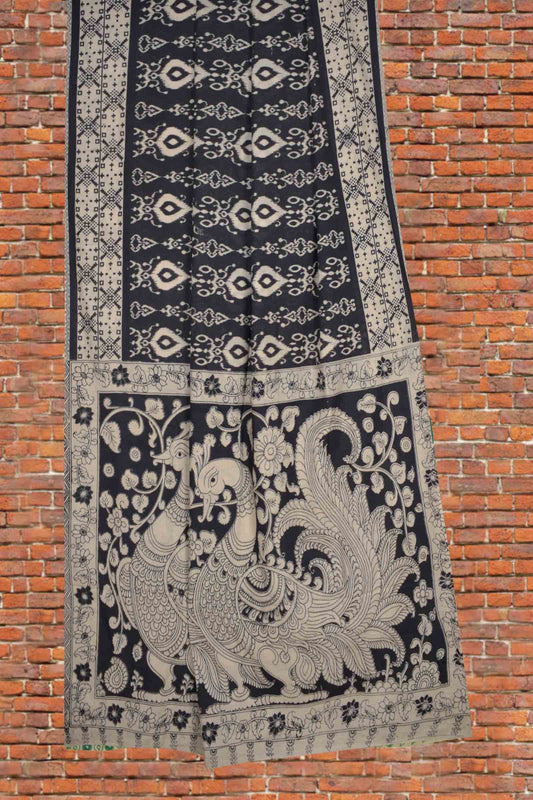 Black Kalamkari Pure Cotton Floral Print Peacock Pallu Saree
