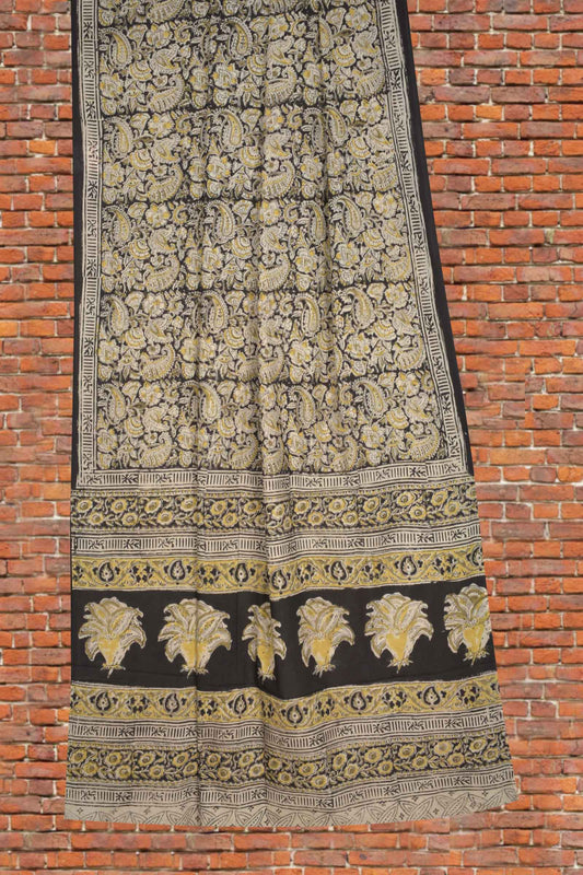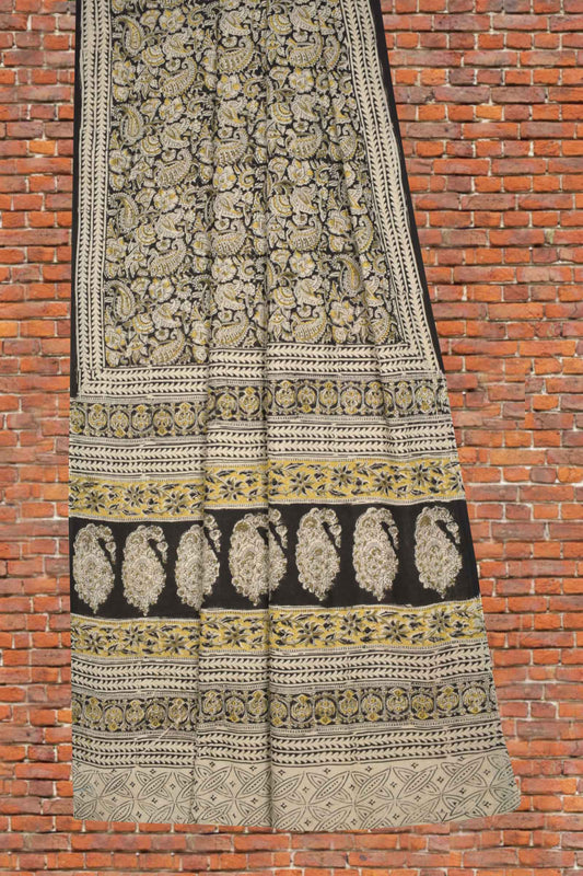 Black Kalamkari Pure Cotton Yellow Paisley Printed Saree