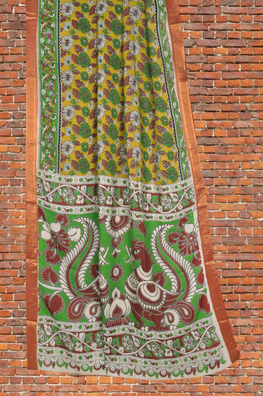 Mustard Yellow Kalamkari Silk Floral Design Zari Border Peacock Pallu Printed Saree