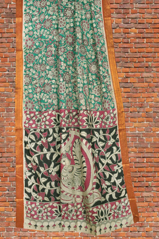 Ever Green Kalamkari Silk Floral Power Zari Border Swan Pallu Saree