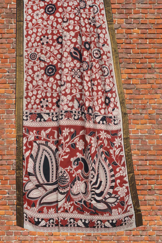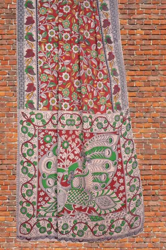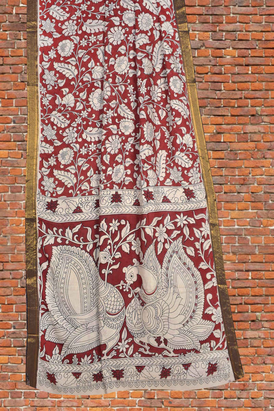 Deep Maroon Kalamkari Silk Royal Gardenia Zari Border Peacock Pallu Saree