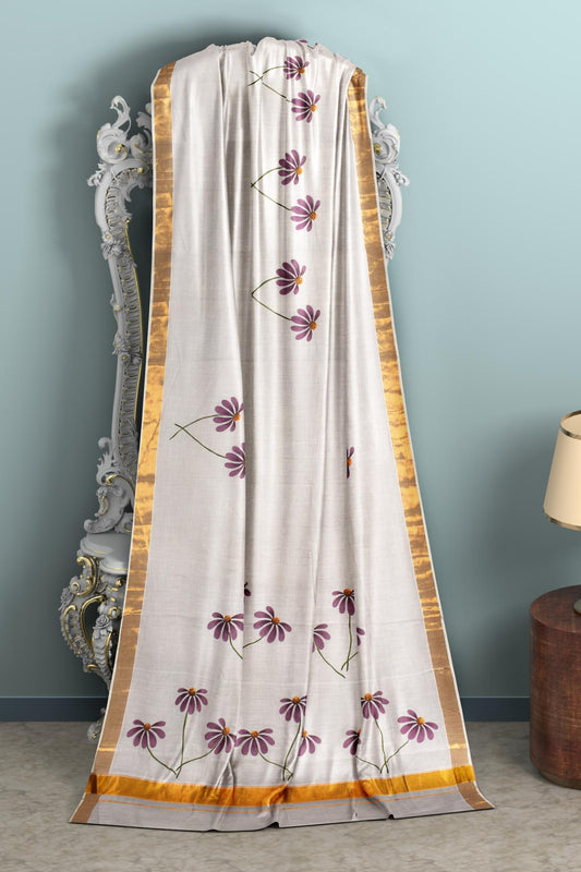 White Kerala Cotton Painted Florals Saree