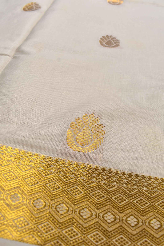 Off White Pure Kerala Cotton Line Butta Grand Golden Lotus Pallu Temple Zari Border Saree