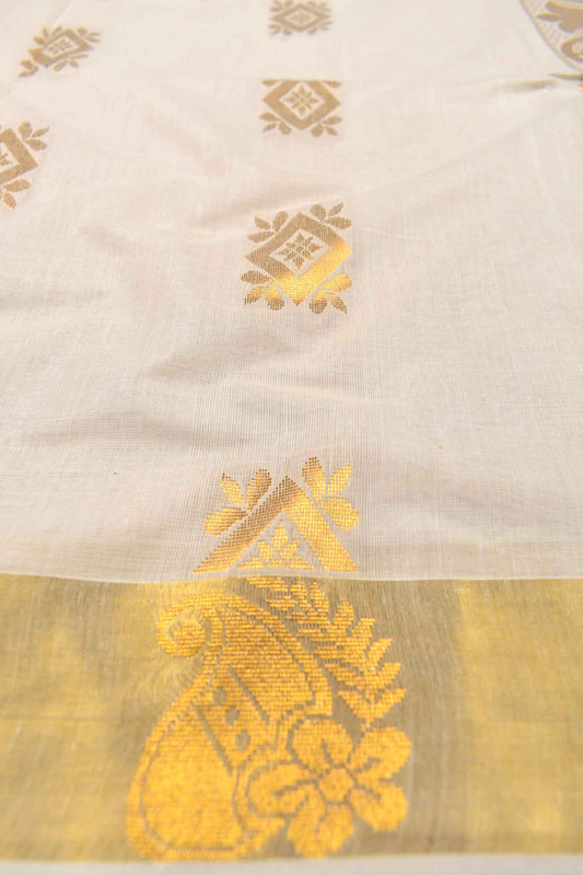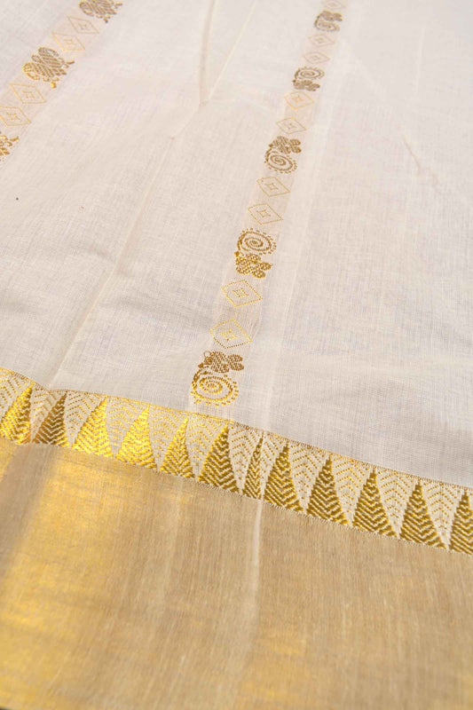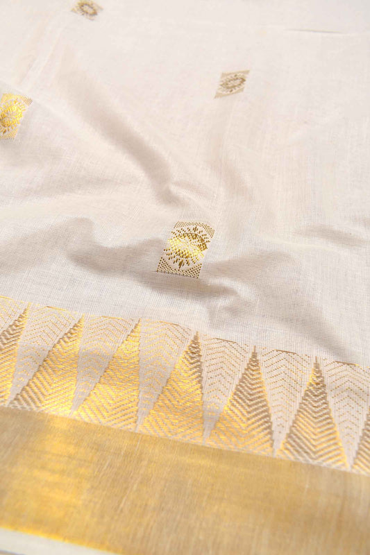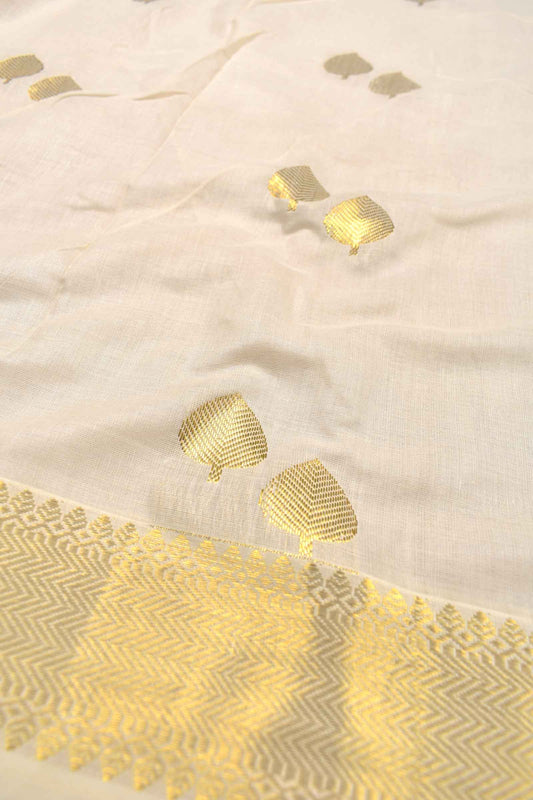 Off White Pure Kerala Cotton Golden Leaves Pallu Zari Border Saree