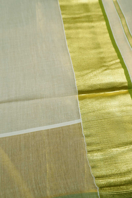Off White Kerala Tissue Cotton Golden Zari Pallu Green Border Saree
