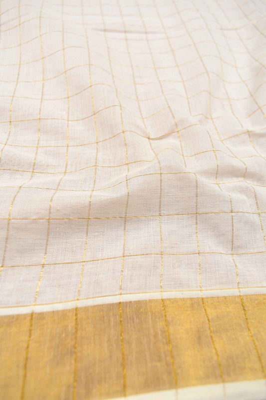 Off White Pure Kerala Cotton Checked Gold Zari Border Saree