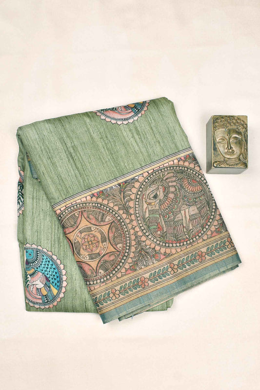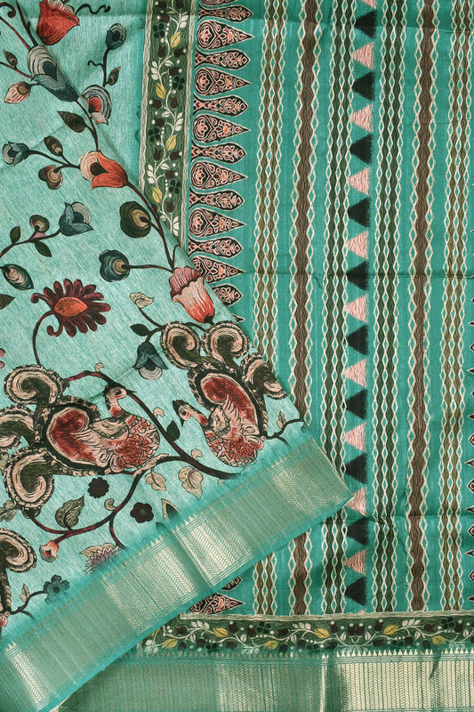 Green Kotha Cotton Fish Design Peacock Pallu Digital Print Saree