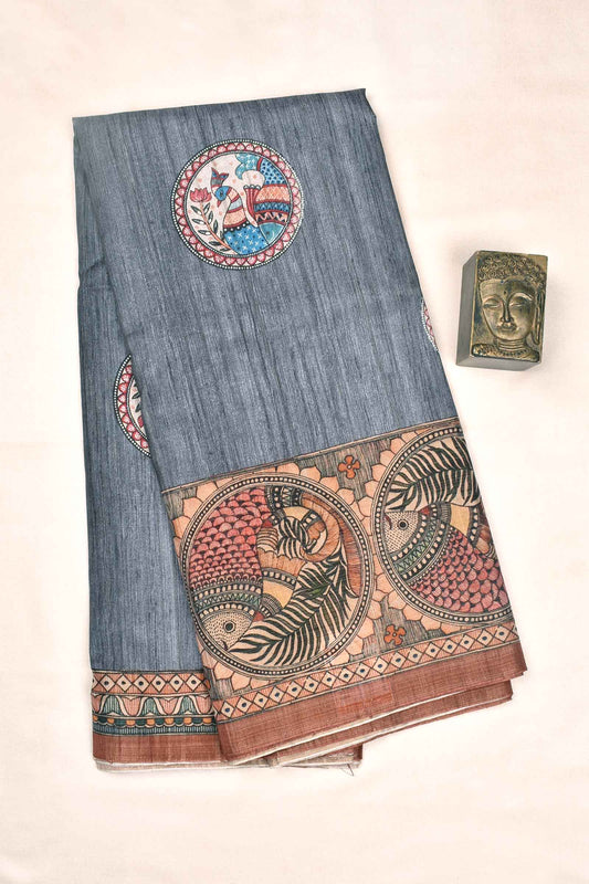 Dark Grey Kotha Cotton Peacock Circles Fish Art Border Contrast Pallu Saree