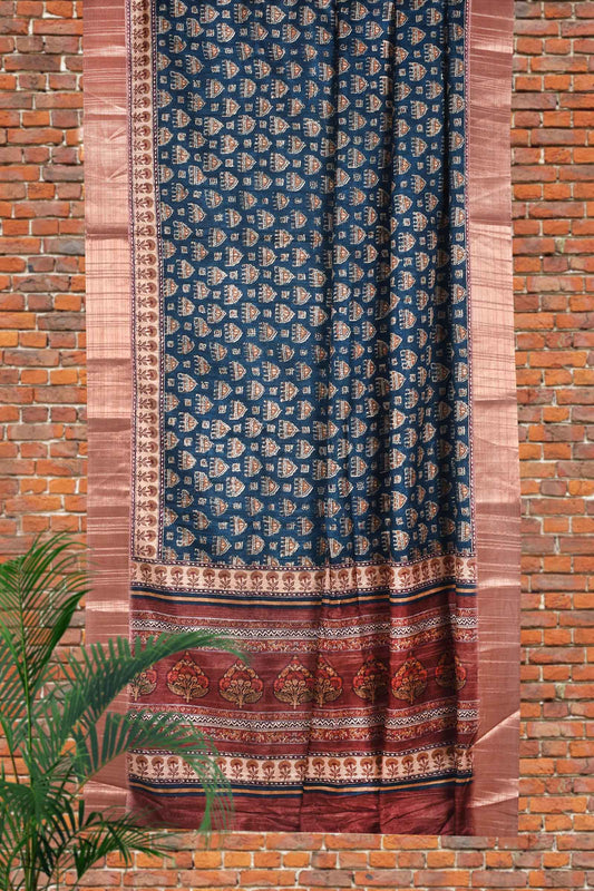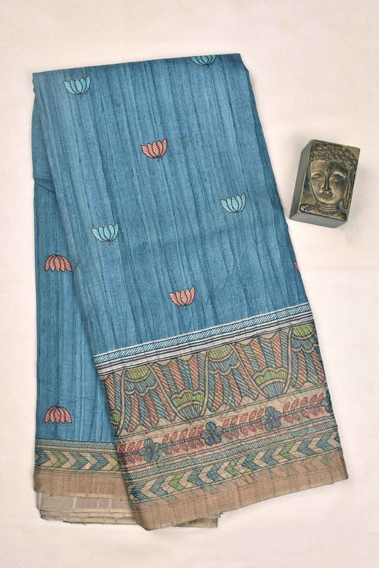 Blue Kotha Cotton Mini Lotus Print Ethnic Art Pallu Saree