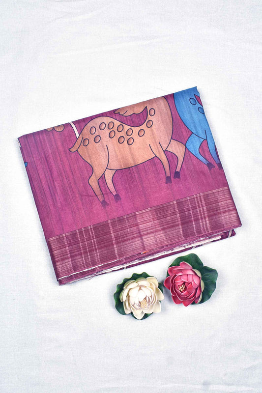Magenta Berry Kotha Cotton Dual Deer Peacock Pallu Digital Print Saree