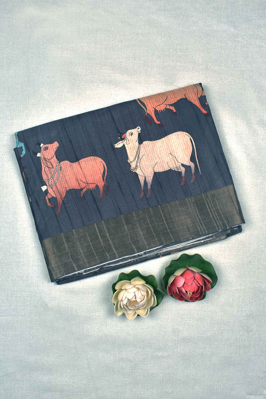 Dark Grey Kotha Cotton All Over Cow Design Ethnic Art Pallu Digital Print Saree