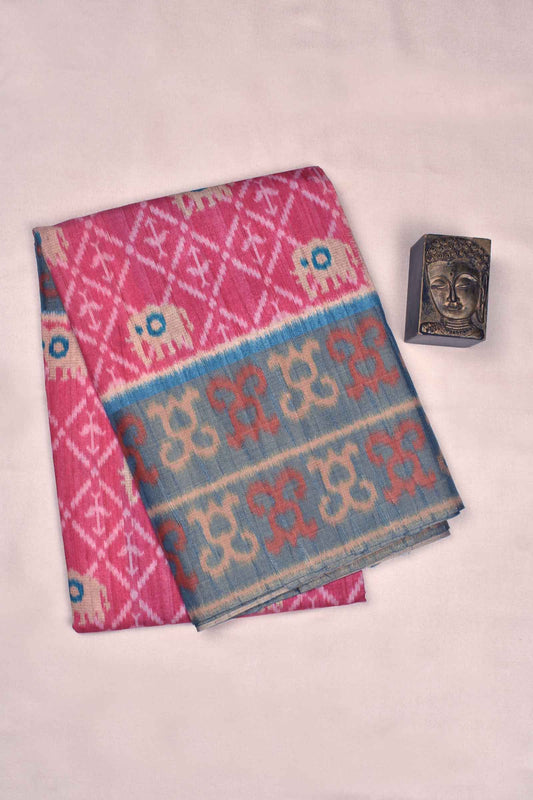 Pink With Blue Kotha Cotton Ikat Style Elephant Print Contrast Pallu Saree