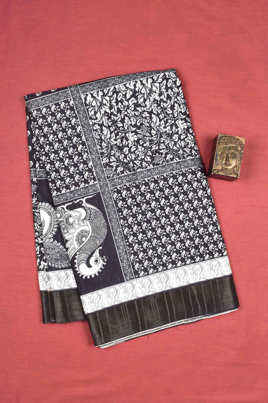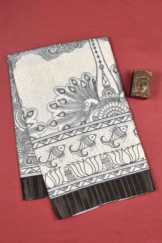 Offwhite and Black Kotha Cotton Fish And Peacock Fancy Digital Print Saree