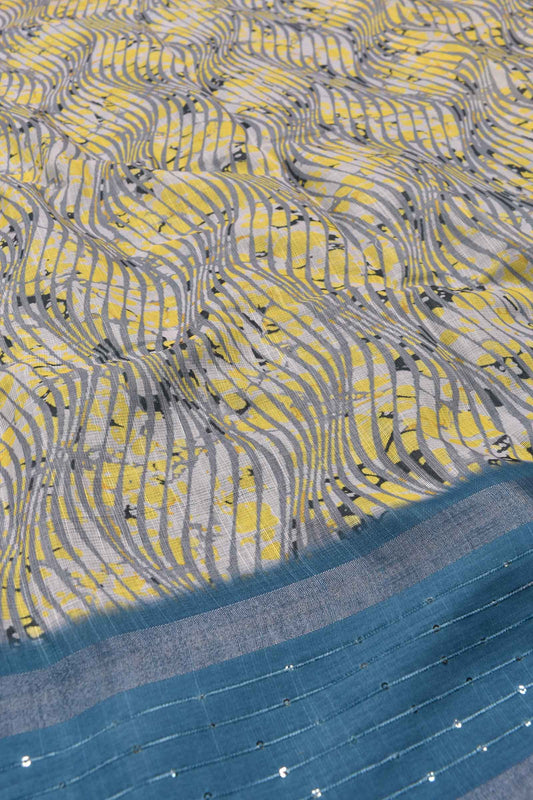 White and Yellow Semi Linen Wave Pattern Sequin Border Saree