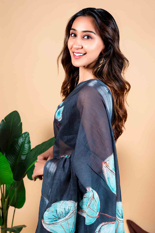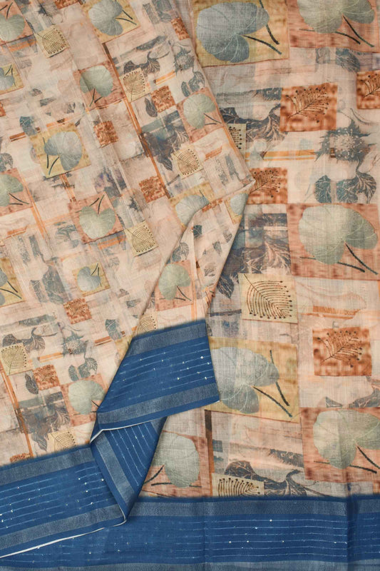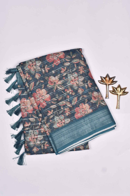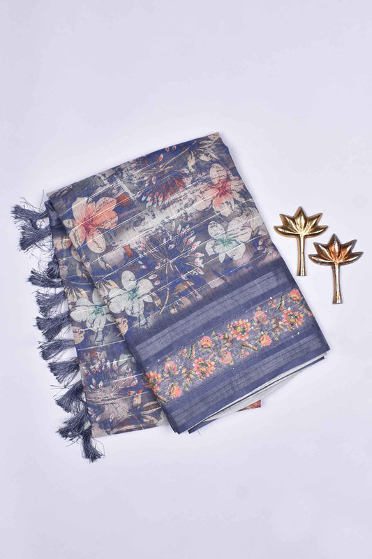 Blue Semi Linen Floral Garden Digital Print Sequins Border Saree