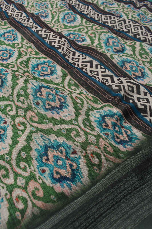 Green Semi Linen Blue Ikkat Style Printed Saree
