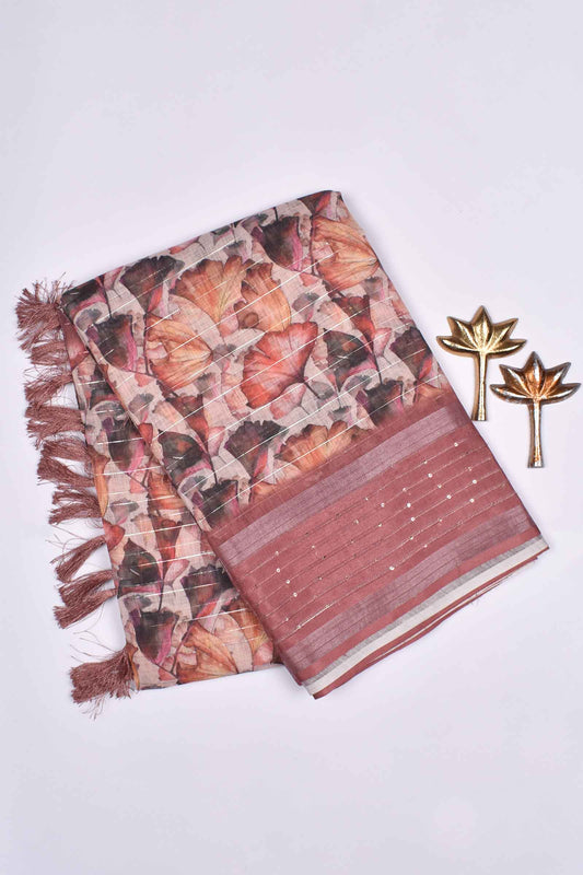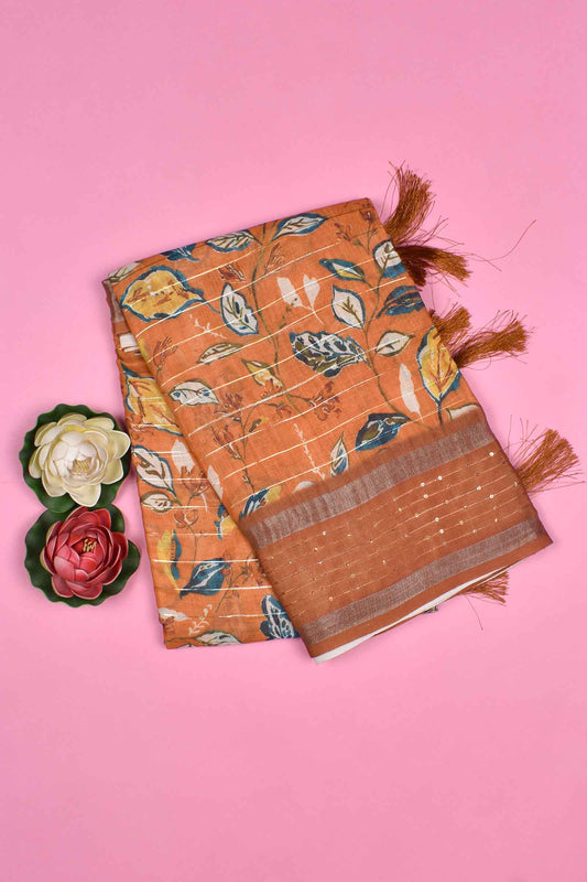 Orange Semi Linen Floral Elegance Sequin Border Saree