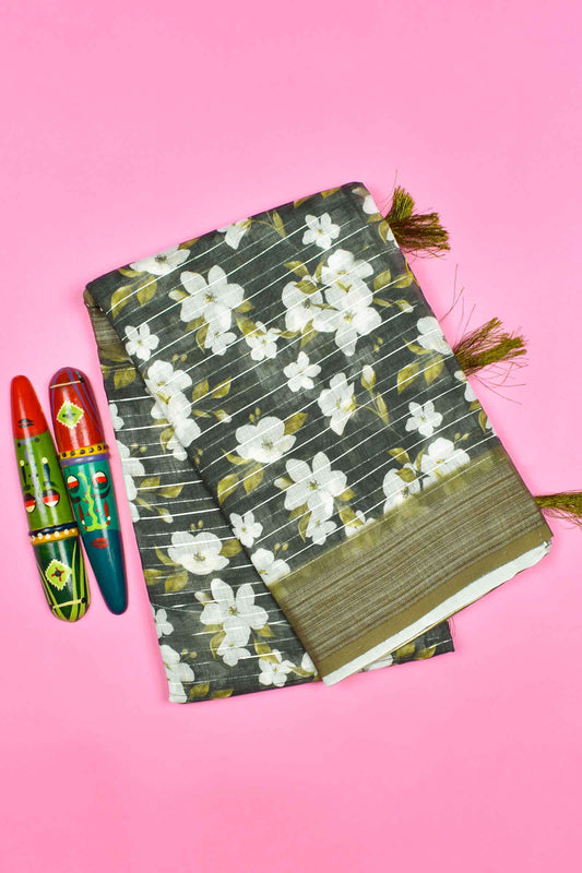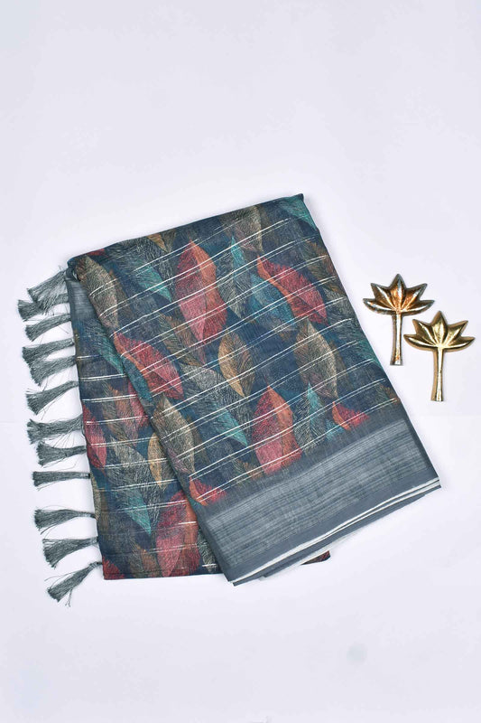 Dark Grey Green Semi Linen Blue Ray Print Saree NAA117