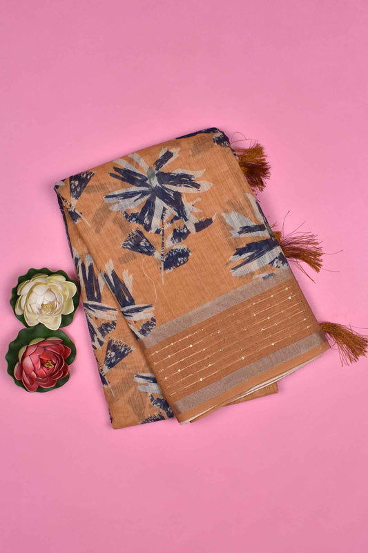 Orange/Blue Semi Linen Floral Elegance Sequin Border Saree