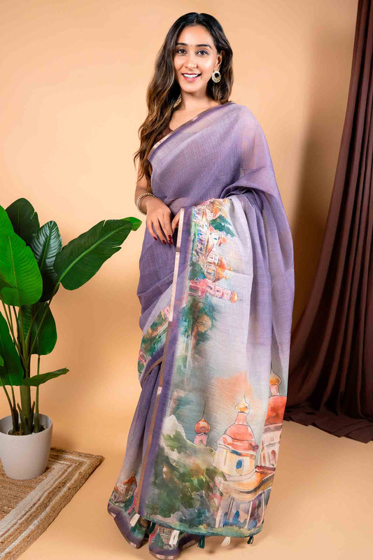 Light Voilet Semi Linen Vintage Domes Digital Print Saree NAA118