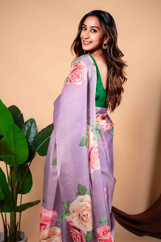 Light Voilet Semi Linen Jumbo Florals Silk Zari Border Digital Print Saree NAA122