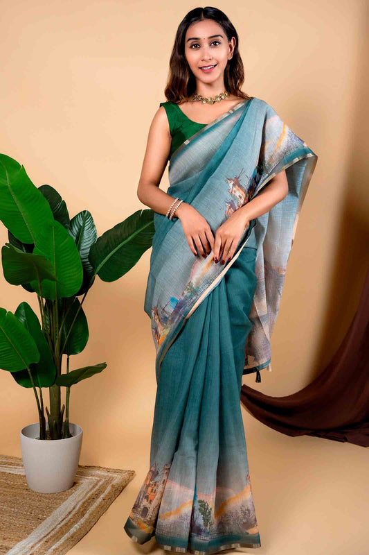Dark Green Semi Linen Digital Print Zari Body Line Saree
