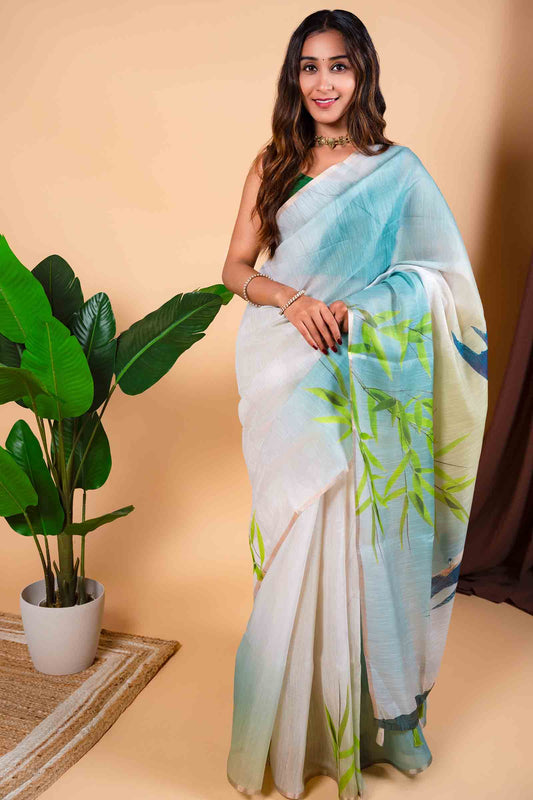 Light Green Semi Linen Bird Wonderland Border Digital Print Saree NAA120