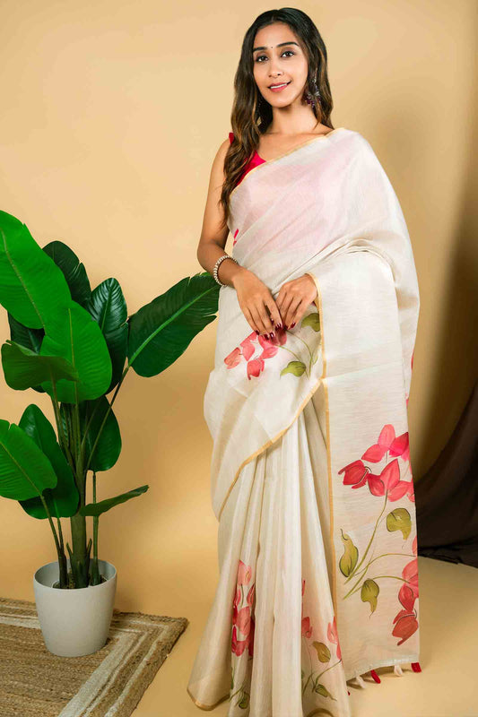 Off White Semi Linen Bouganvillea Digital Print Saree NAA121