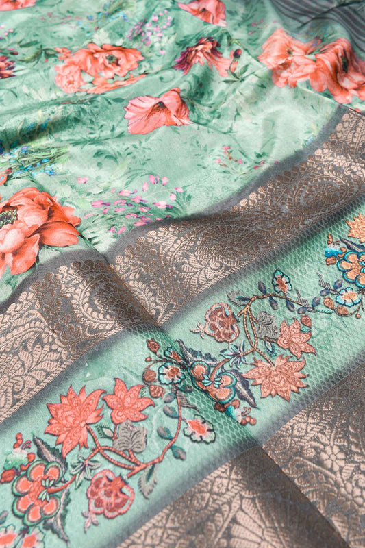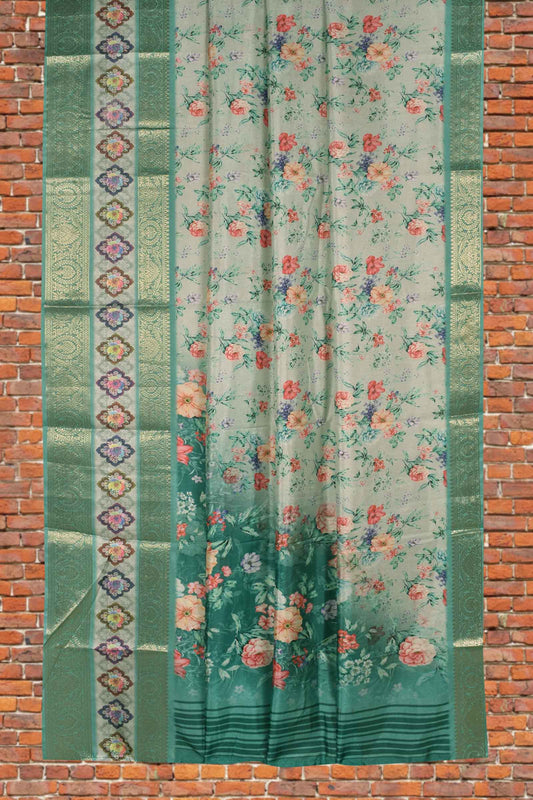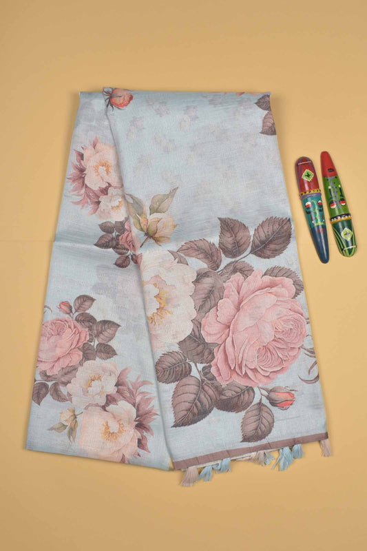 Light Blue Semi Linen Jumbo Roses Silk Zari Border Digital Print Saree