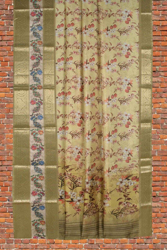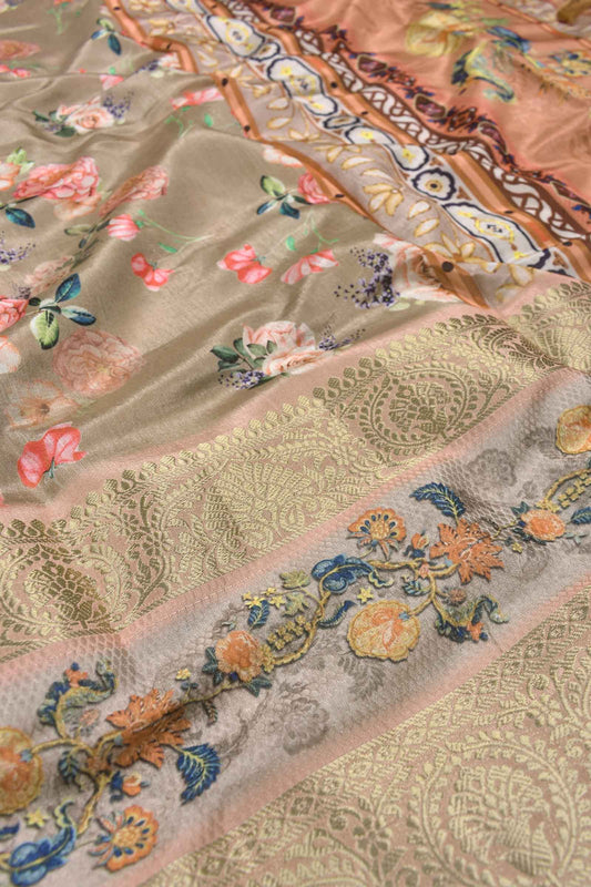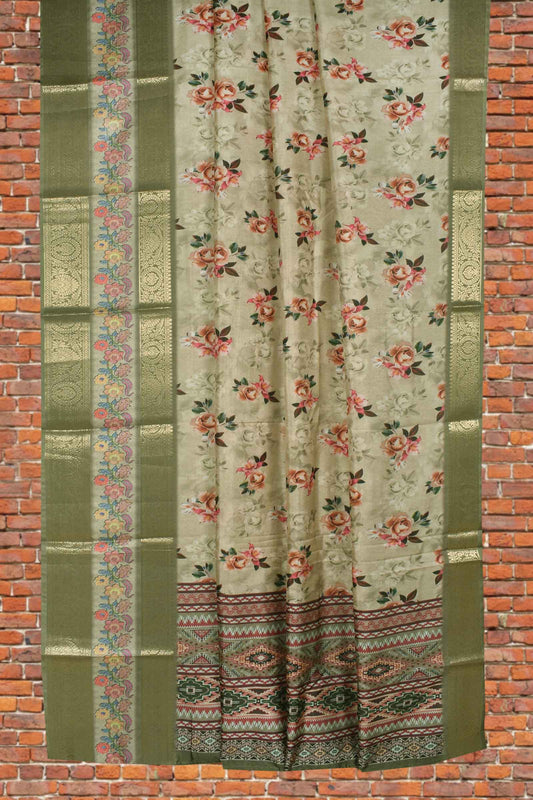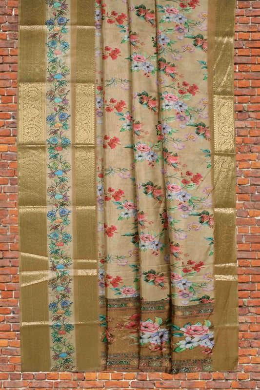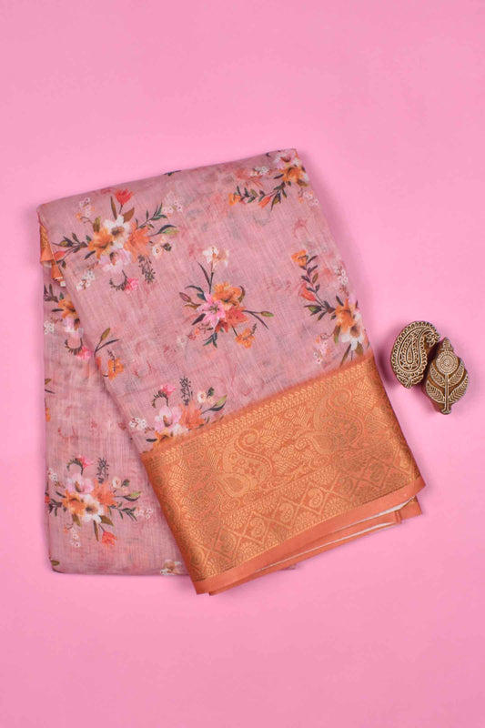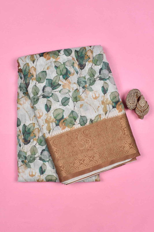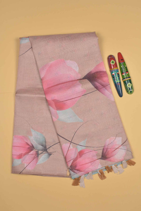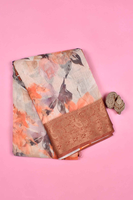 Light Brown Semi Linen Paper Tulips Silk Zari Border Digital Print Saree
