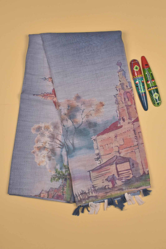 Grey Semi Linen Vintage Countryside Digital Print Saree