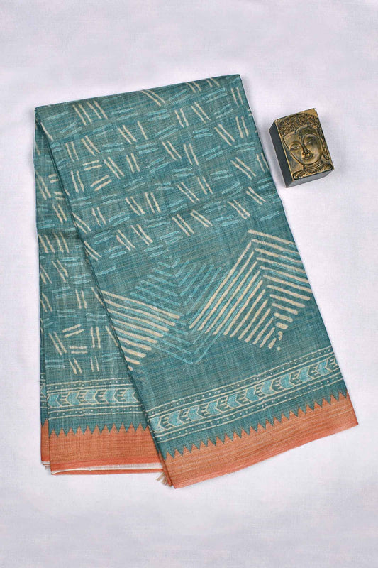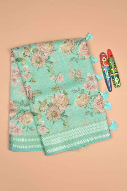Mint Green Semi Linen Rose Garden Digital Print Zari Lines Tissue Saree